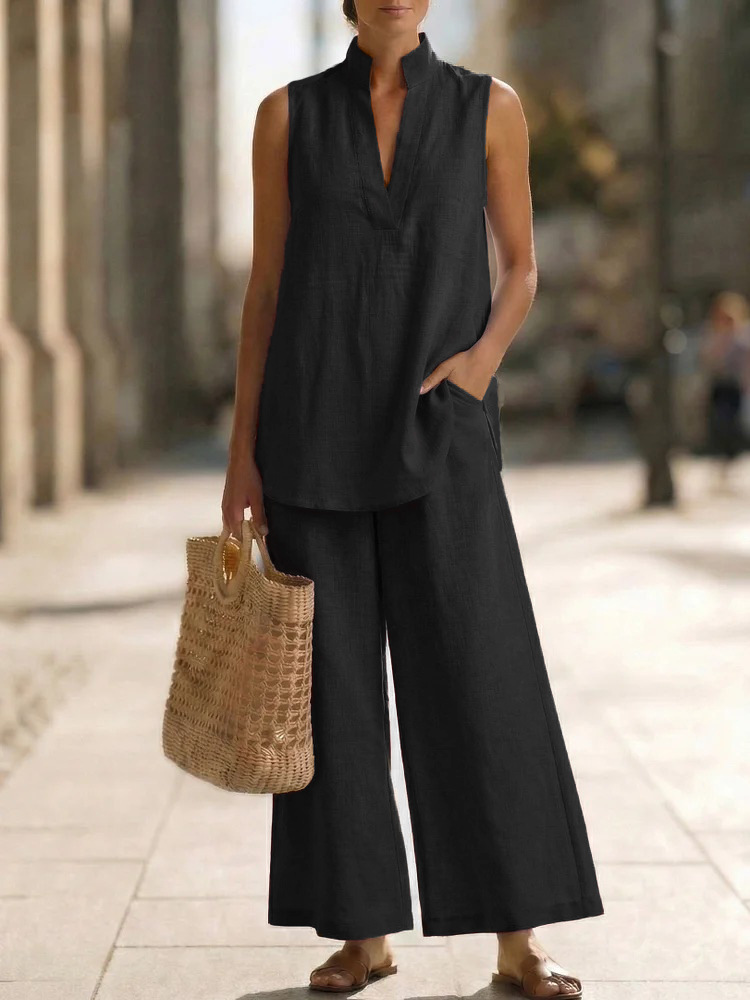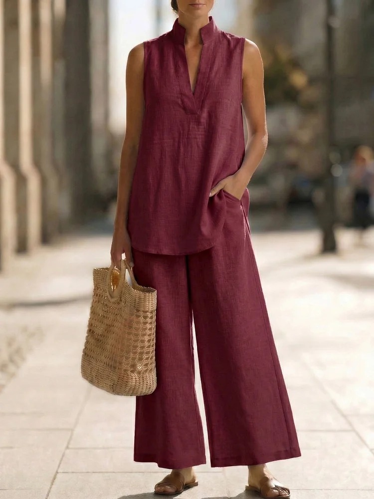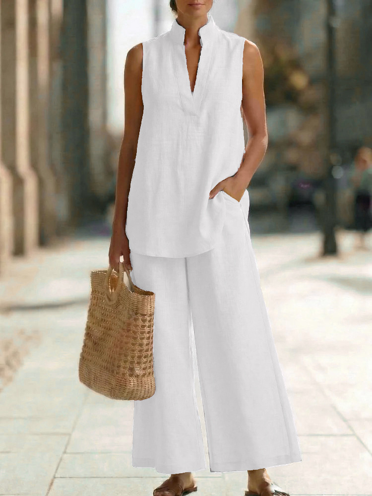 Women's Sleeveless V-Neck Casual Cotton And Linen Set